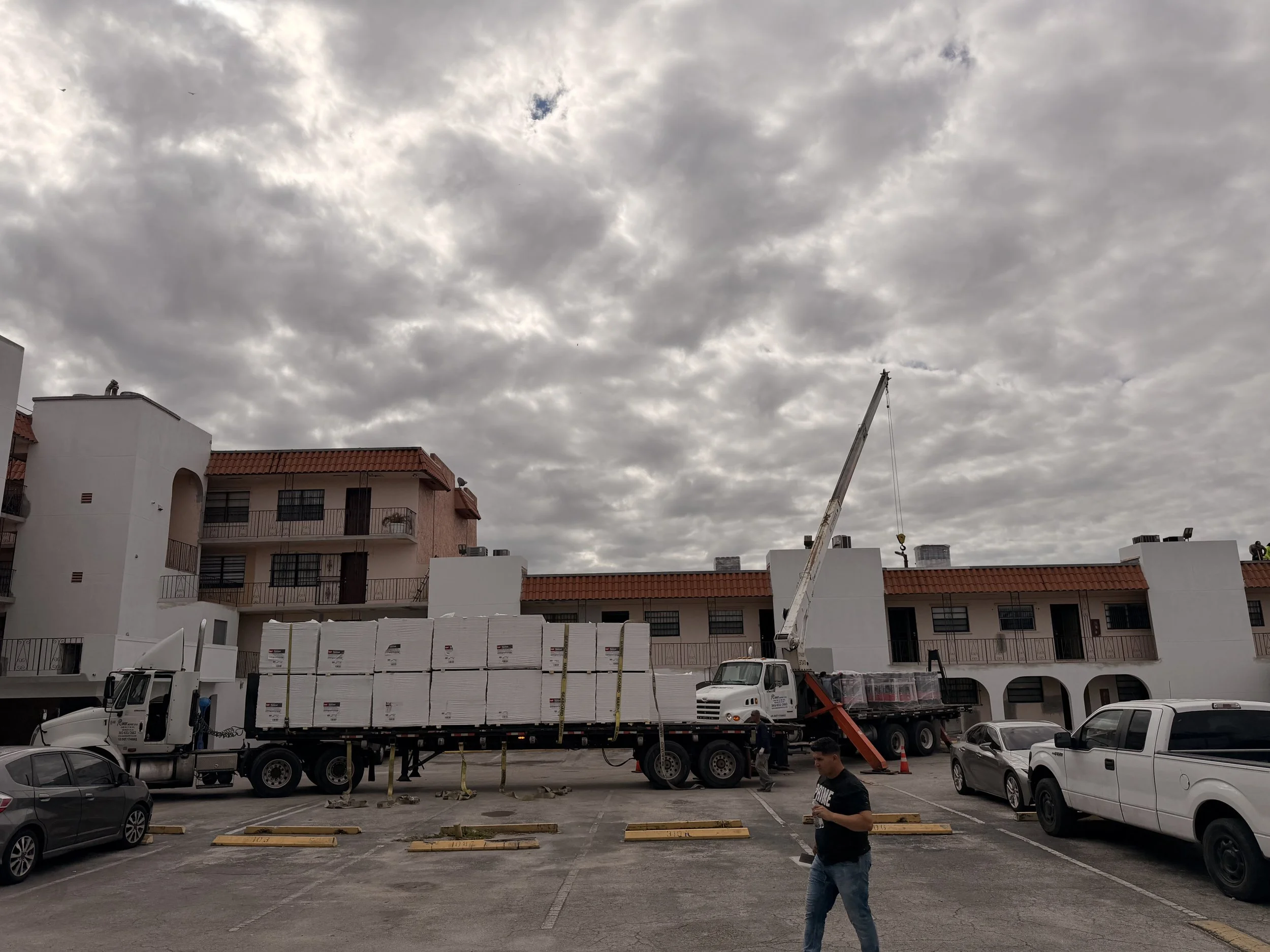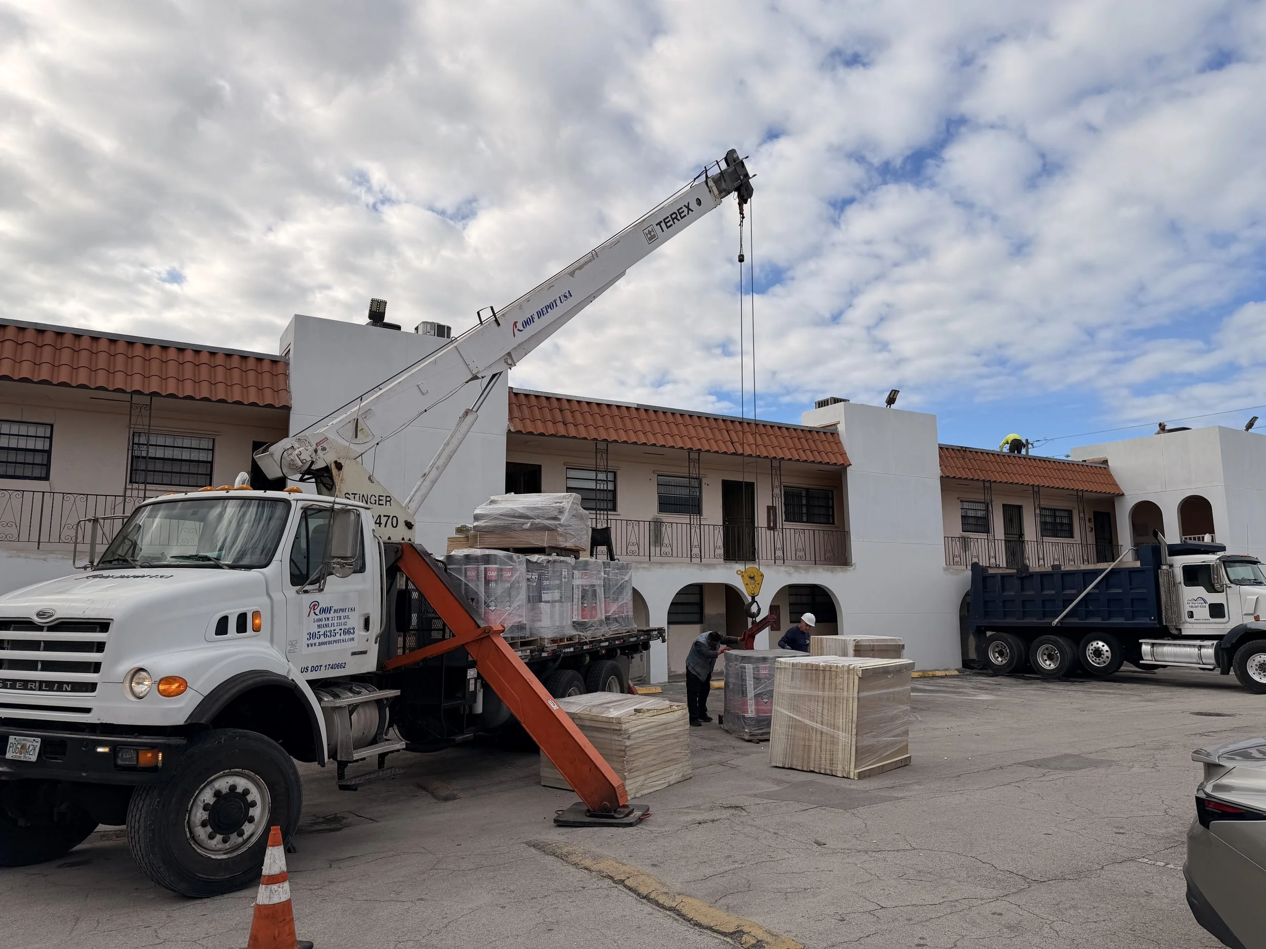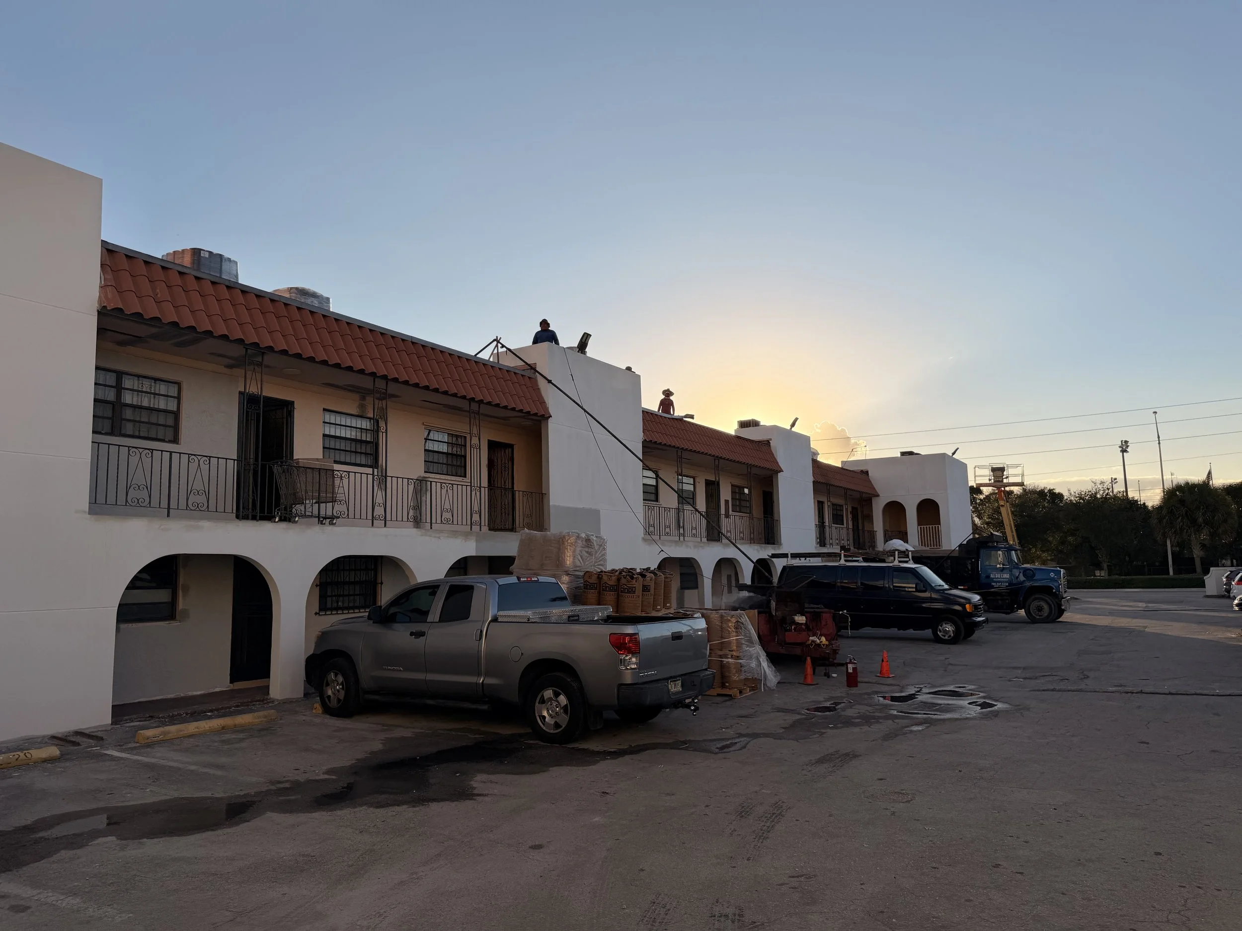 Reroof in progress at Miami Lakes Hotel. Roof tile delivery + placement