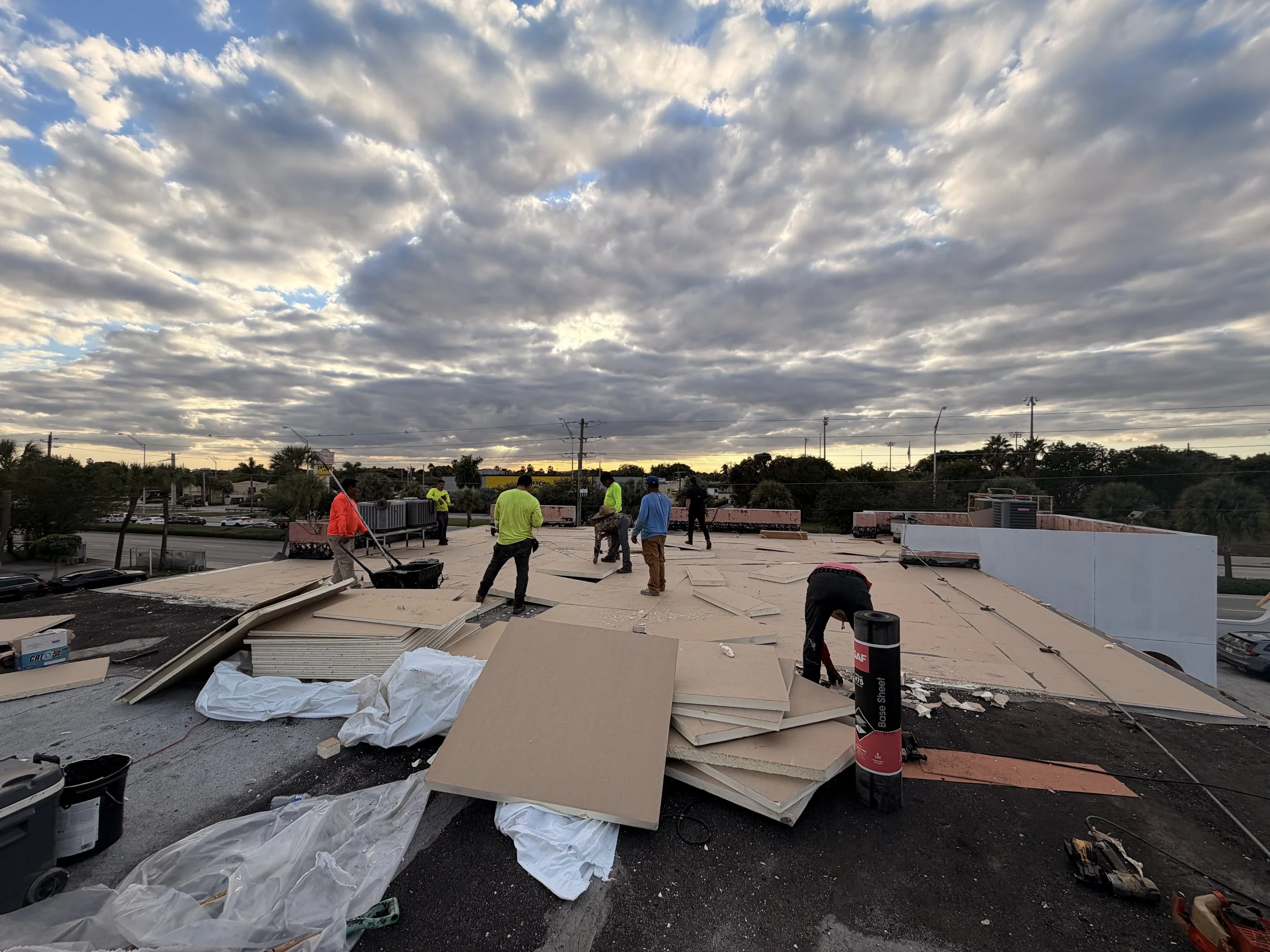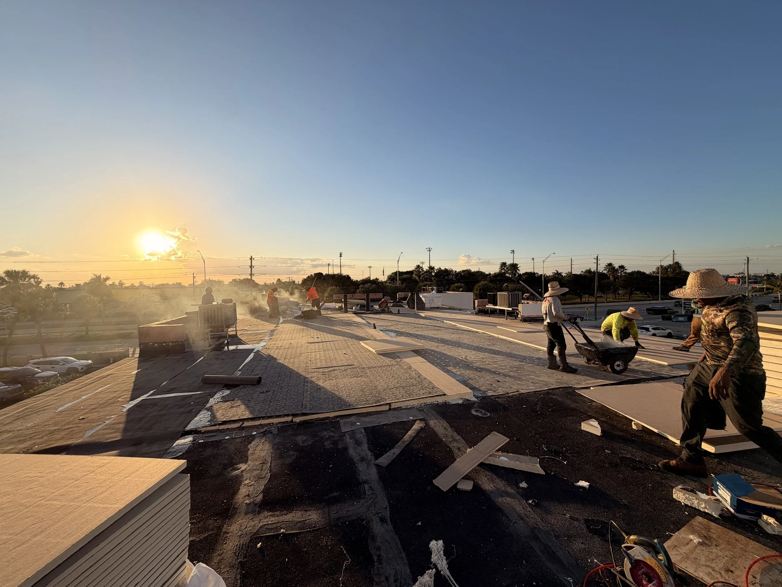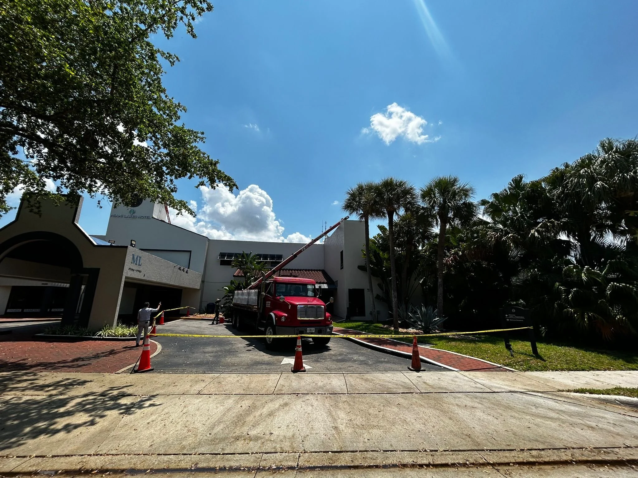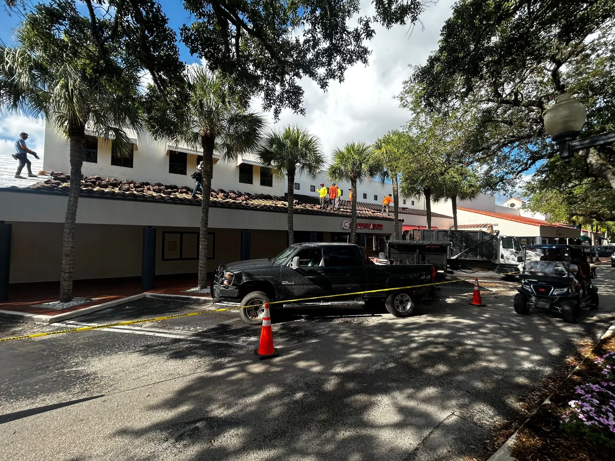 Reroof in progress at Miami Lakes Hotel. Roof tile delivery + placement