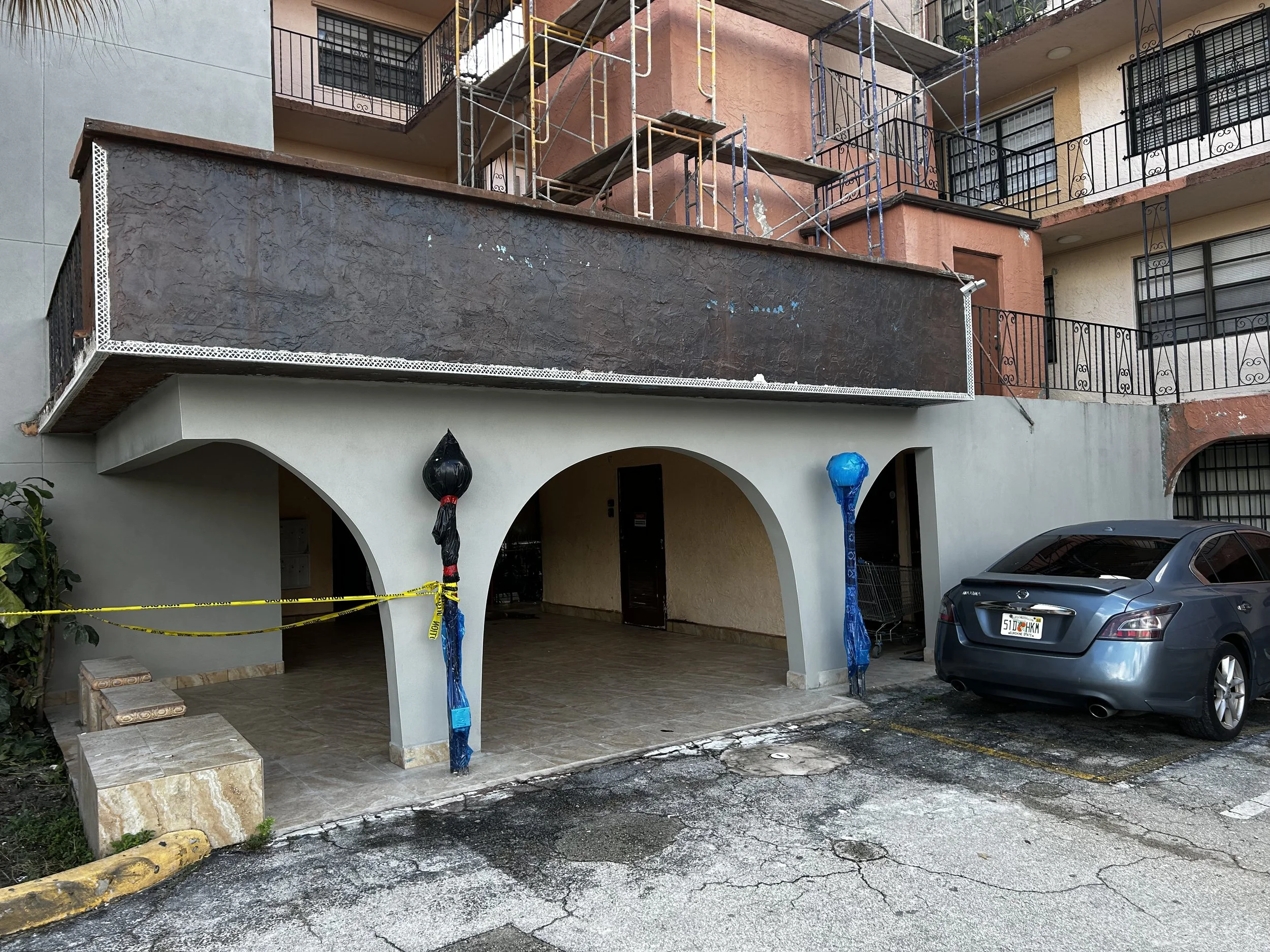 New porcelain tile installed + refurbished balcony railings + full paint job in Miami Lakes Hotel
