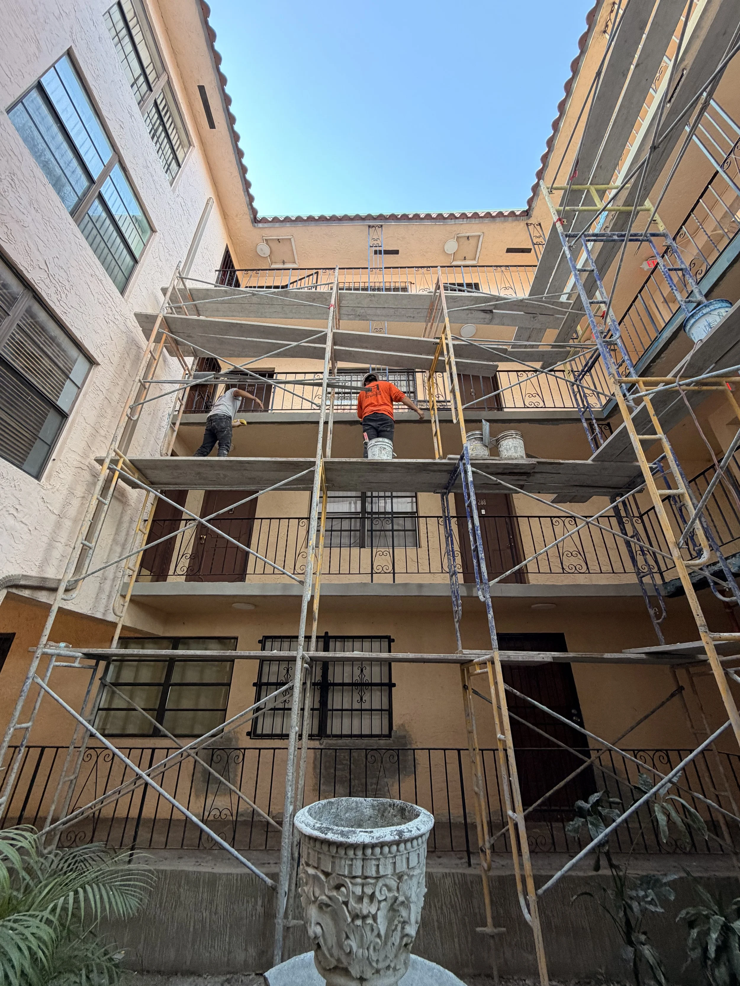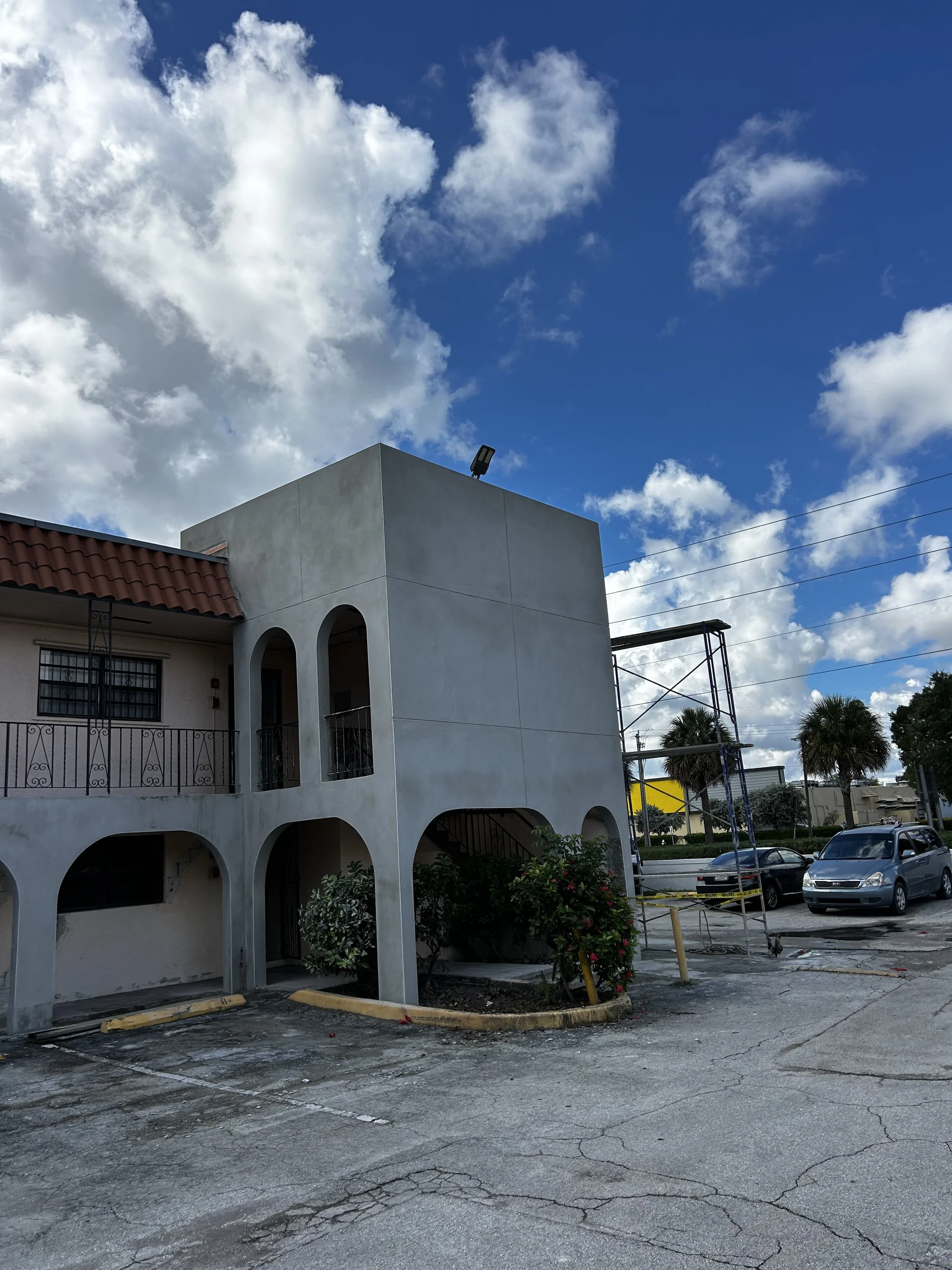 New porcelain tile installed + refurbished balcony rail + full paint job at Miami Lakes Hotel